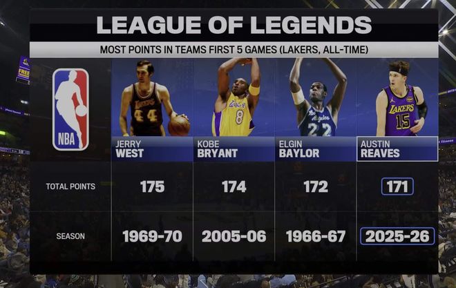 随着卢卡-东契奇的复出奥斯汀-里夫斯的球权占有率、出手率都会下滑,首节5中2,三分2中0,罚球3中3,拿到7分1篮板1助攻1抢断,东契奇首节是13分。官方给到里夫斯前五场比赛171分湖人队史第四,仅次于韦斯特、科比、贝勒。